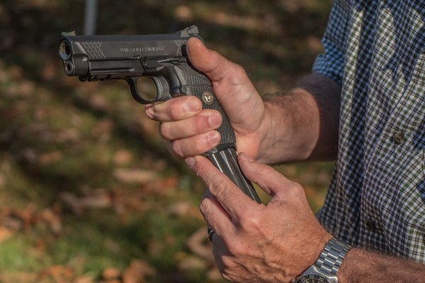 When it comes time to reload your handgun, pull it in front of your face. When retracting your pistol into this zone, your firing hand elbow should contact your lower ribcage and your elbow should be bent as if you’re at the apex of a bicep curl. You should be able to view your target through the triggerguard of your pistol, and the magazine well will be pointed toward your left pants pocket. In this position, the magwell will be open to accepting your reload. Press the magazine into the grip until it stops. With upward pressure on the magazine, use your firing hand thumb to sweep the slide release downward to close the slide and chamber a fresh round. If your firing-hand thumb is not strong enough or long enough to complete this action, utilize your support-hand thumb to depress the slide release. These two methods are the quickest, most efficient techniques to reload your pistol.