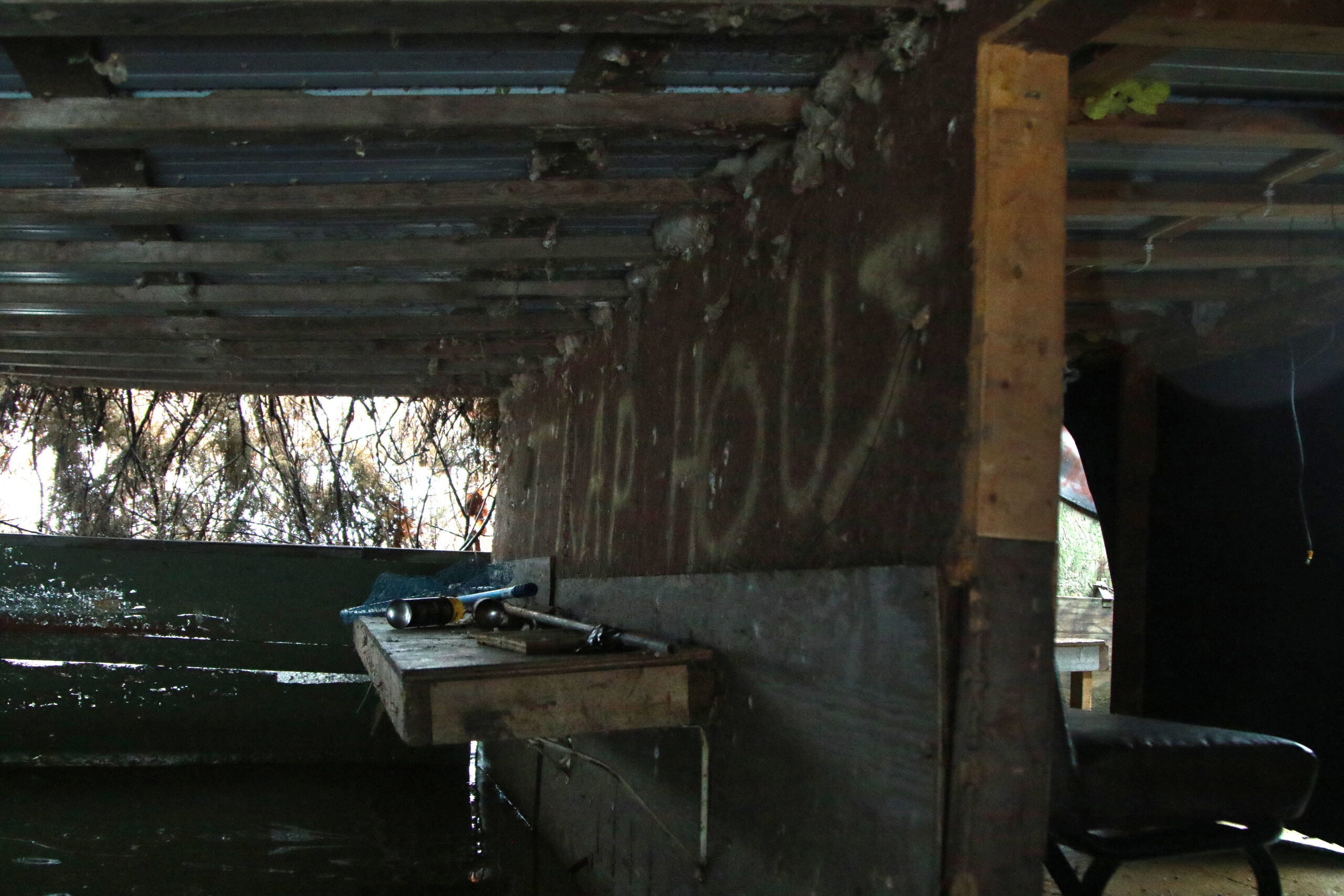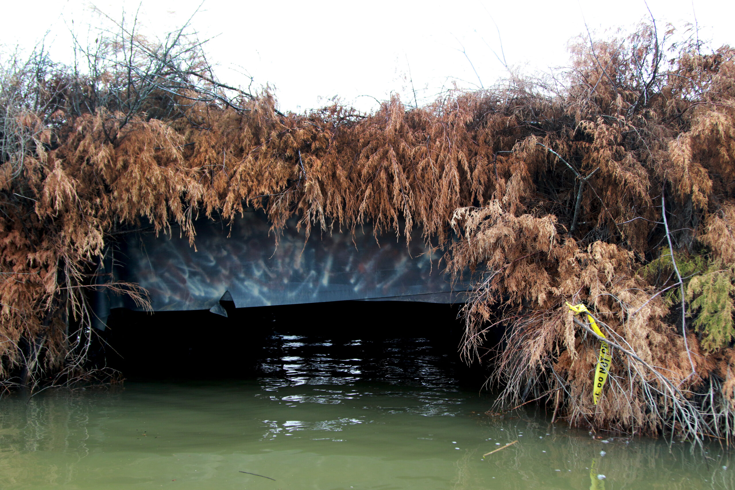 Blind 58 is a low-ceilinged structure built of scrap wood, and it’s brushed-in roof to waterline with leafy branches. There are 10 shooting holes at the front of the blind. Sheets of rubber roofing hang behind the shooting holes to hold heat in the kitchen and the seating area at the back of the blind. A short, wide doorway opens into the attached boathouse. The whole structure is approximately 30 feet wide and 29 feet deep. From a distance, it looks like a small, brushy island floating in the marsh.