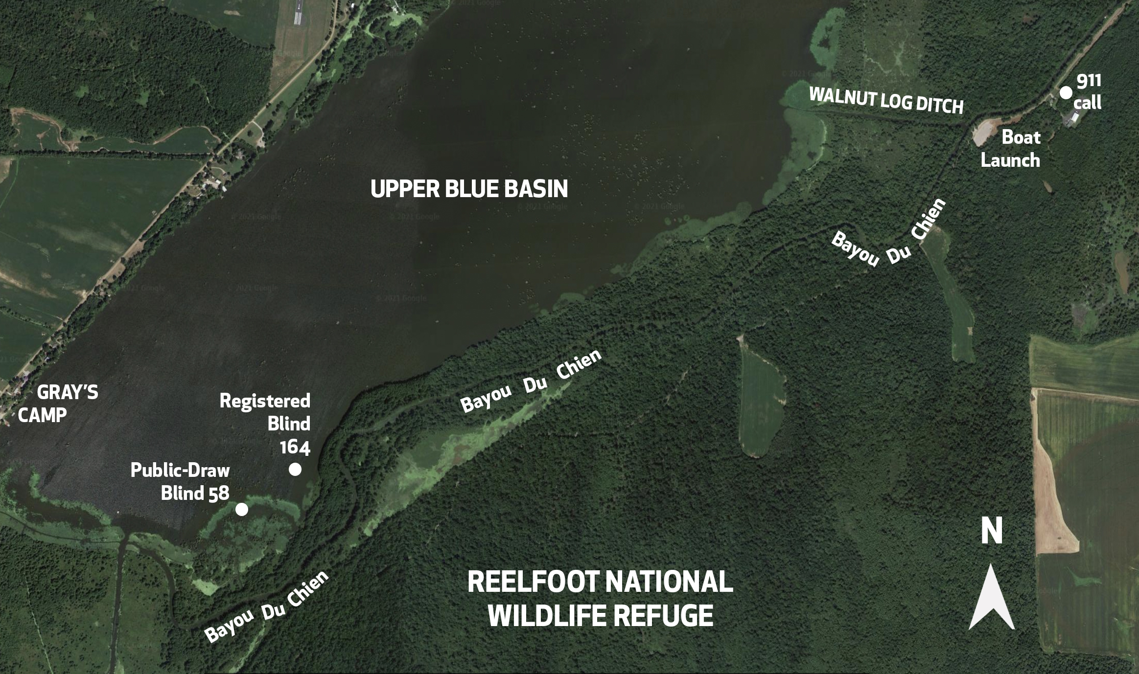 At what he guesses was about 8:30 a.m., Crabtree spotted a boat idling through the stump-strewn waters of the Upper Blue Basin, headed from the northwest shore to the private blind that sits approximately 250 yards away, at their 11 o’clock. But Crabtree never saw any of the spinner decoys turn on at registered blind 164. He didn’t hear any shooting either.