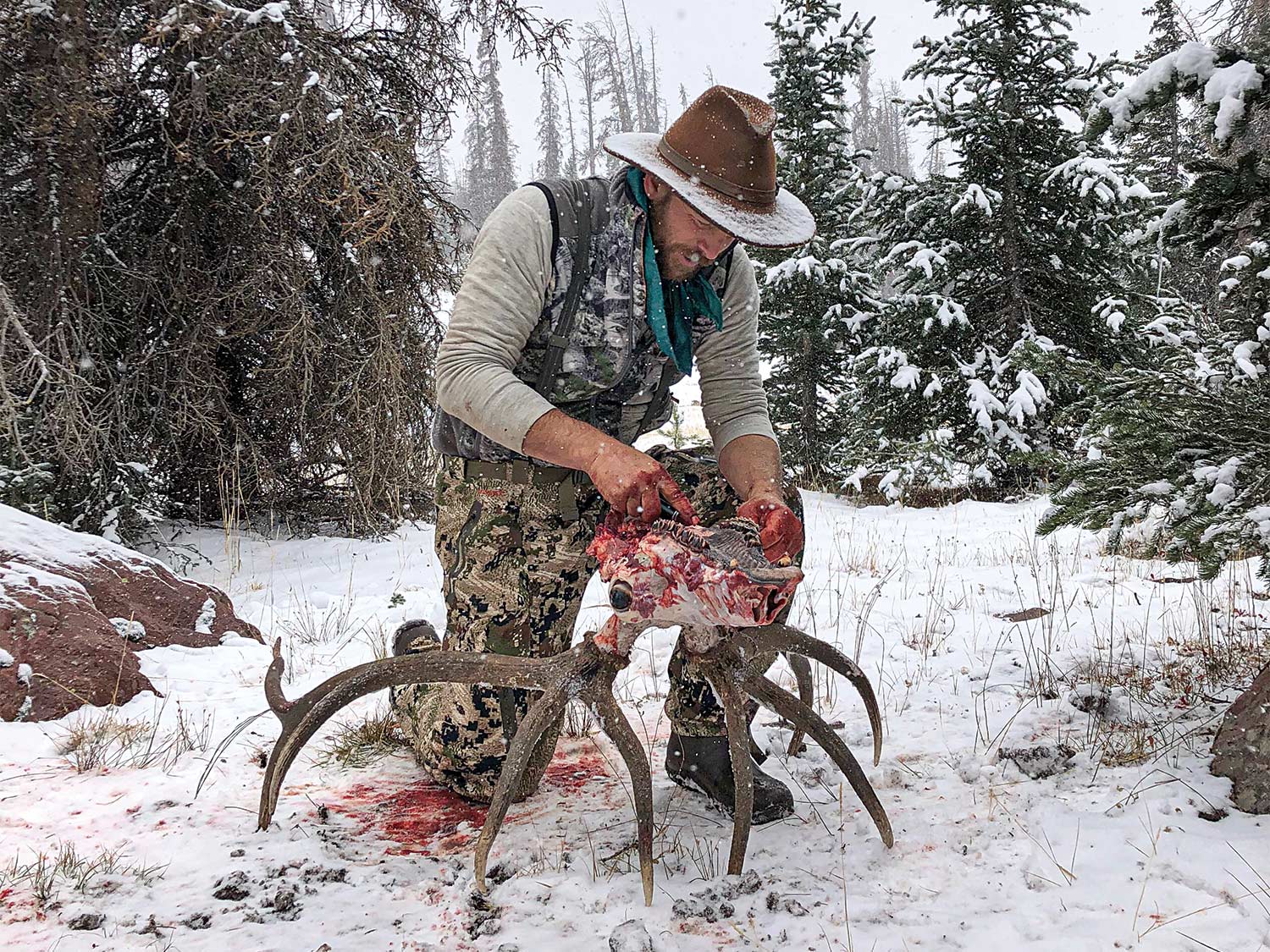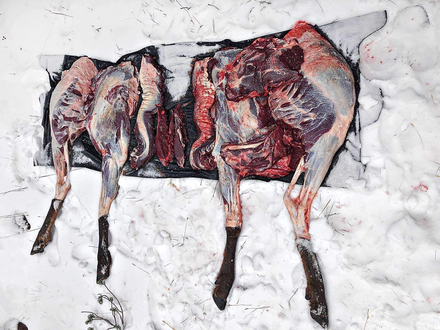 If I wasn’t already glad Aram had taken the shot, I certainly am now. I’d contributed nothing to this hunt so far besides company, and Aram had earned his elk in every way. The bull is a handsome 5×6, and we set to quartering him. It feels as if we have all the time in the world: It’s barely an hour into opening day, and there’s already an elk on the ground. I fillet meat from the neck as Aram skins the skull, the brim of his hat gathering snow. As we work, we talk of everything, and nothing at all.