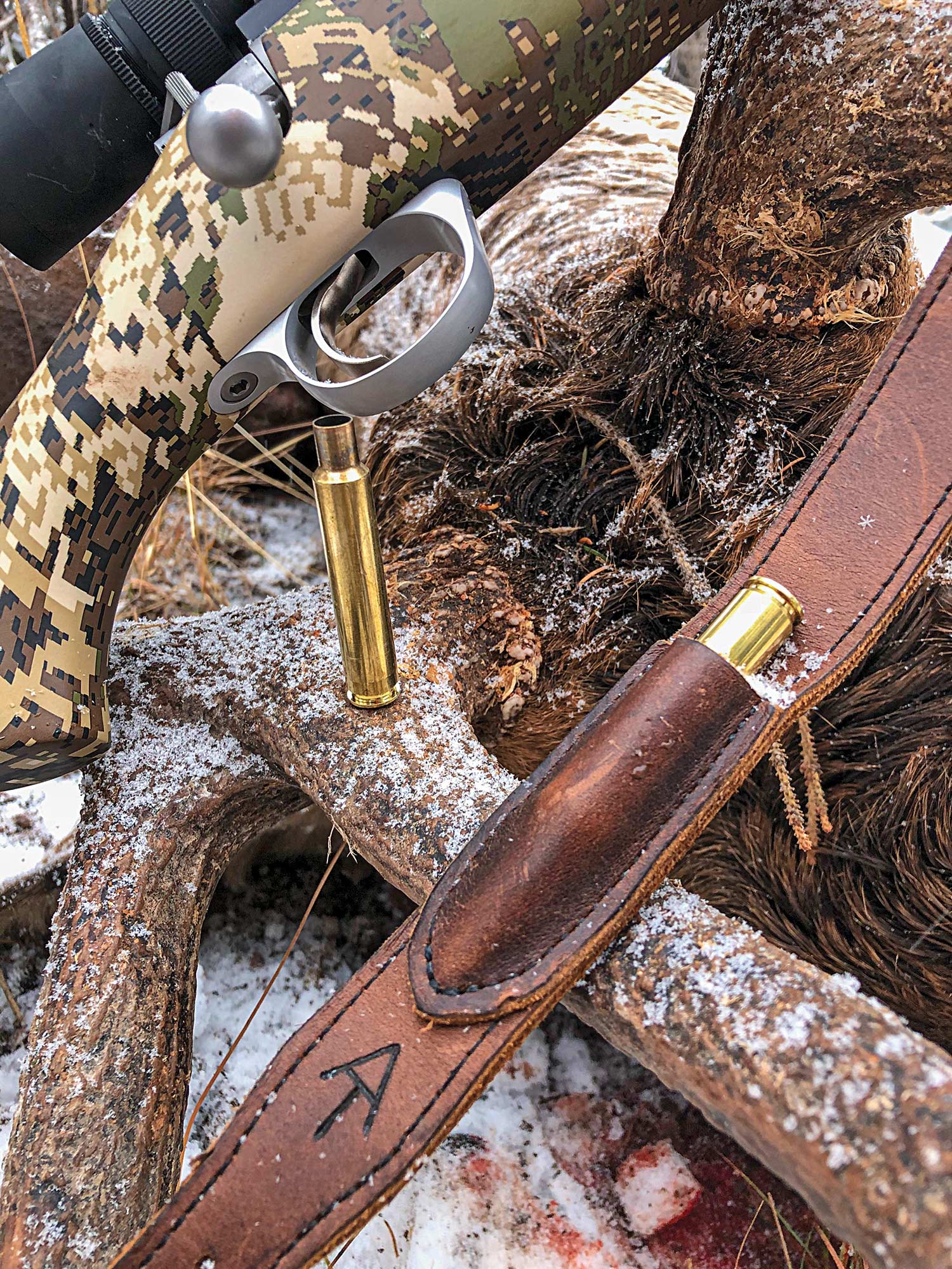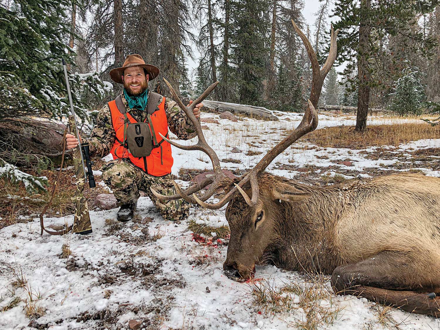 My thoughts turn back to the task at hand when I step off the last boulder and onto fresh elk tracks. Snow had fallen less than an hour ago, and this spoor is on top of it. A cow, it looks like, and a bull. No—two bulls. I wave Natalie into step behind me, and we follow their trail. The tracks weave across the bench and through broken clumps of high-elevation evergreens. The cover thins as we work toward the basin rim, a sheer wall of mountain stretching skyward. These prints can be only minutes old and are growing fresher with every step.