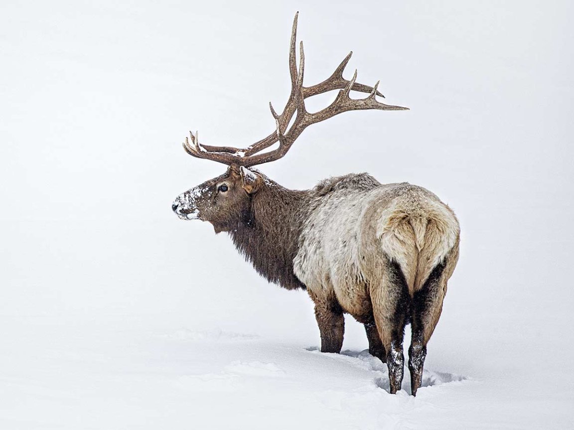For a full minute we strain our ears and hear nothing but settling snowflakes. Then branches begin to snap as the bull closes the distance, shouldering his way through the pines. I see a flash of tawny hide, and dark forelegs. There’s one tree left between us when I glimpse his antlers. He’s a good bull. I already know the answer, but I ask Aram anyway.