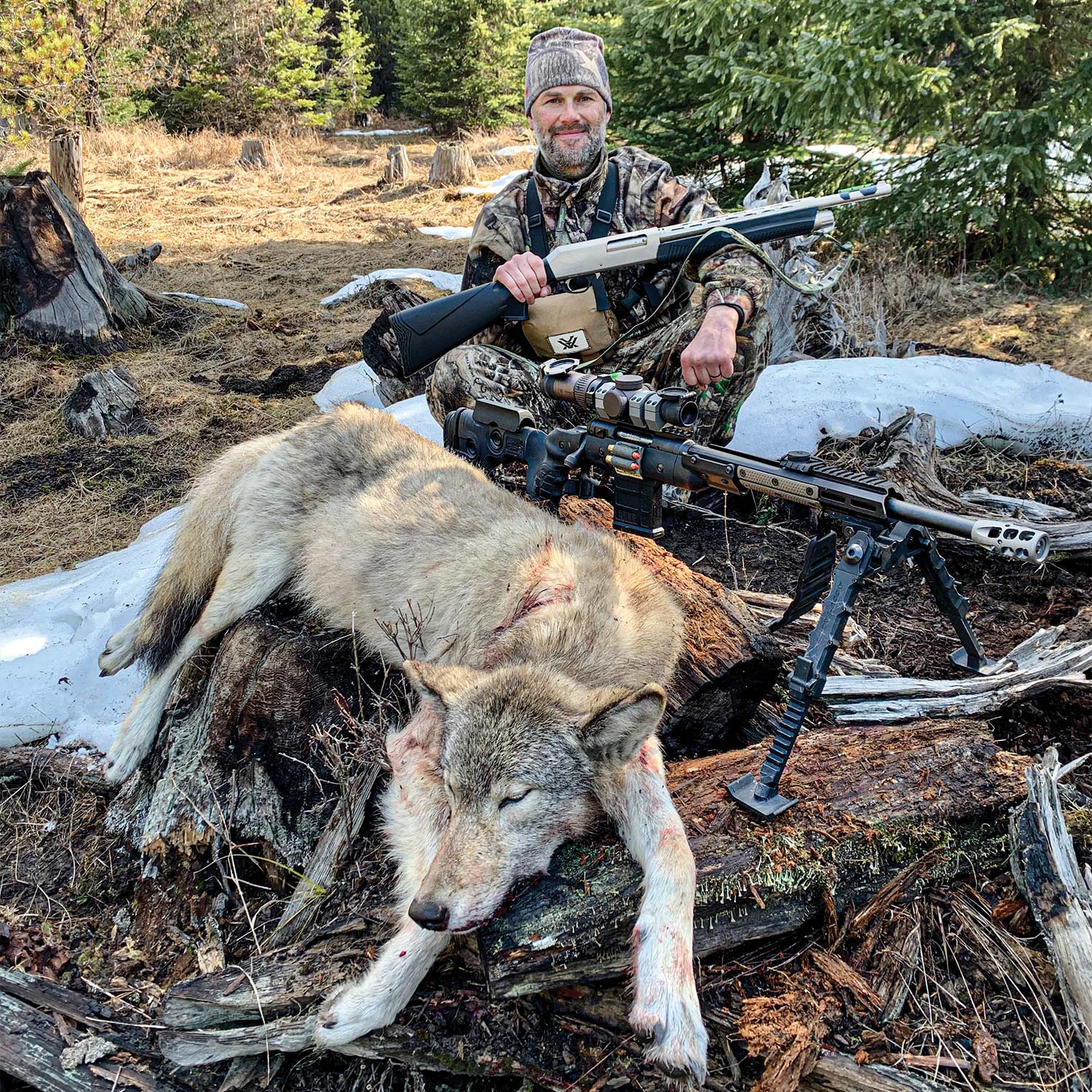 Williams says that for his first decade as a wolf hunter, he was badly undergunned. “I hunted with my elk rifle, a .30/06 that had trouble grouping beyond about 200 yards. I wasn’t able to reach out to distant wolves, but I also couldn’t get on wolves in the thick stuff. So I’ve gone with a 7mm STW on a chassis stock with a scope that I can dial for shots out to 1,000 yards. That’s a great dead-winter, long-distance setup. But I also have a shotgun with an 18-inch barrel and Federal FliteControl buckshot loads that will put all 9 pellets in a pie plate at 50 yards. More of my shots, especially when I’m elk hunting, are in thick stuff inside 100 yards and often inside 50 yards. So I also have a semi-auto, folding-stock carbine with a low-power scope that I have set up in either 9mm or 40 S&W that I’ll carry for wolves during elk bow season.”