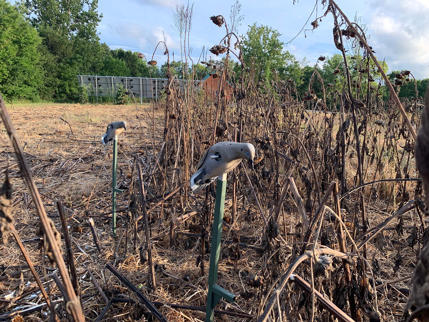 Most hunters only have one or two dove spinners. I get it. They hunt doves once or twice a year. There’s no reason to have any more. But I will use 6 to 10 later in the season. After the first week, I will take the wings off multiple decoys and just stake them out in the field on the Mojo poles. Some folks like to use dove decoys that clip on to the sunflowers or wire, to mimic doves on a powerline. Those will work too. Watch how birds use the field and set up the decoys accordingly. Sometimes doves will fly straight to the ground. When I see that, I prop decoys upright on the ground as long as the field is not too weedy. If the birds can get a good visual on the decoy, you should try this. You can also use Mojo’s Dove-a-Flickrs. If birds are landing on flower heads first, I keep the spinners on their stands.