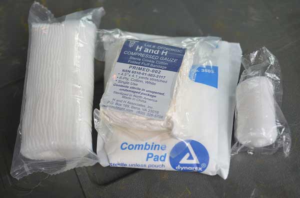 - Dressings – Sure, you could stop bleeding with your bare hand or some old rag you found, but bandages are better for bleeding control. You’ll want to carry multiple dressings in several different sizes. Pack your kit with small things like Band-aids for simple cuts. Load up with 4×4-inch pads, and one or two larger trauma pad dressings. Rolled gauze is also very useful as a dressing material, wound packing, or as something to bind other dressings in place.