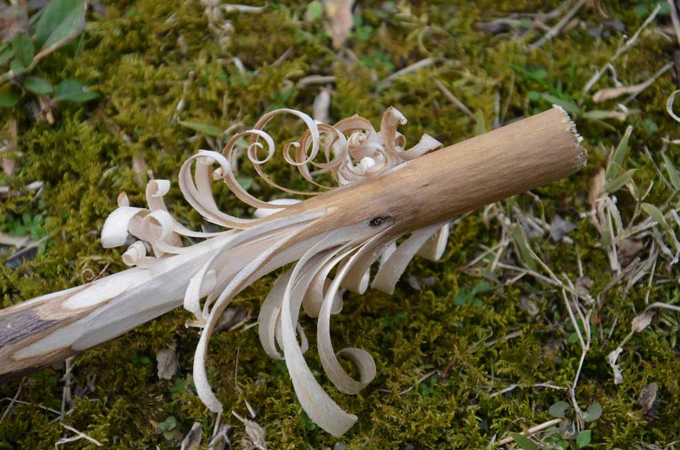 Once you have mastered the fuzz stick, it’s time to graduate to the feather stick. This fire starter requires better carving skills, but it also provides a better burn. Feather sticks have longer wood shavings than fuzz sticks. These longer shavings are also curled into rings and still attached to the stick. Since the feather stick exposes more surface area in the material of the stick, it allows the wood to burn more quickly and with higher heat than a fuzz stick (or the regular stick). Two of the main tricks for carving feather sticks are material selection and knife pressure. I prefer to use straight-grained sticks and split pieces from larger wood, selecting sticks that are free of knots or defects. When you begin carving, experiment with the pressure you apply to the knife. You’ll want to create some side pressure (pushing the side of the blade toward the side of the stick) as you push the knife edge downward to make the cut. Once you have the right combination of pressure in both directions (and the right angle on your blade), you should begin to carve long curling strips. Make each curl near the last one and allow them to stack up near each other. Repeat this as many times as you can, and if any curls are accidentally sliced off, tuck them inside the attached curls. They’ll still burn.