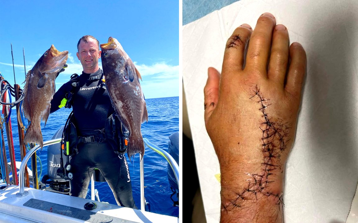 Once on the surface, his dive buddies hurried over and pulled him in the boat. The doctor who was onboard went straight into ER mode, removing Fayard’s glove and wrapping his hand tightly with a towel to stem the bleeding. The boat’s captain used his inReach to contact emergency services, and by the time they were 10 miles out, a Wildlife and Fisheries boat showed up to re-dress Fayard’s hand and escort them into the marina. From there, Fayard was transported to one hospital, and then another, where he underwent surgery to repair the severed tendons in his right hand and wrist.