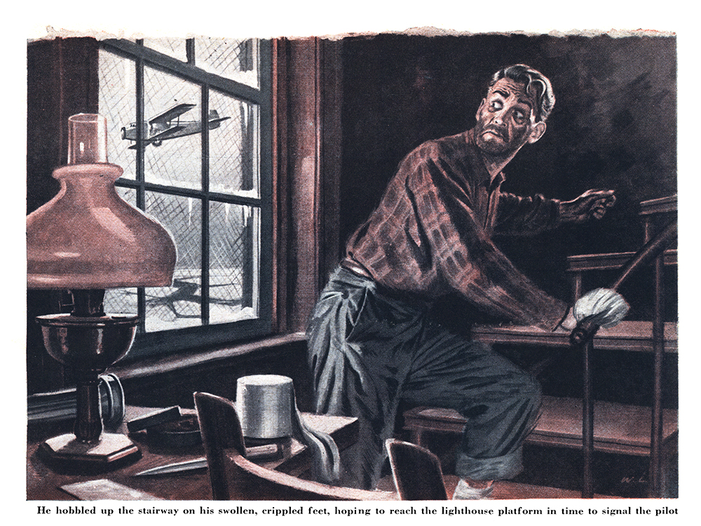 While the pilot made that one swift circle Lewis Sweet was hobbling up the flight of iron stairs as fast as his swollen, painful feet would carry him. But he was too late. When he reached the lens room and stepped out through the door the plane was far out over the lake, disappearing swiftly in the south.