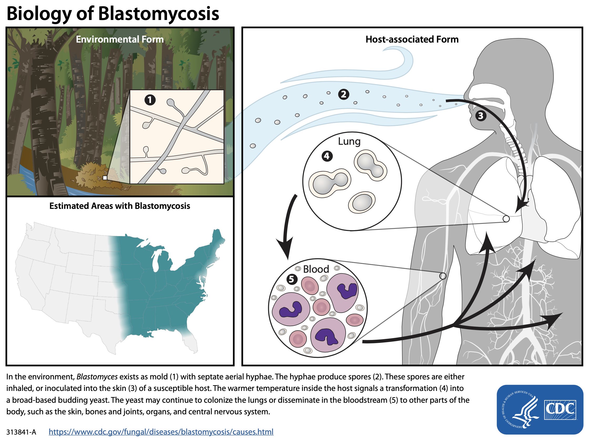 This fungal infection is found in the eastern half of North America, usually in moist soil and decomposing leaves and organic matter, and along waterways. According to the Center for Disease Control and Prevention, people who participate in outdoor activities that expose them to wooded areas (such as forestry work, hunting, and camping) in these areas may be at higher risk for getting blastomycosis, although people with weakened immune systems are more likely to develop severe blastomycosis. The real concern with this fungal infection is that your dog is 10 times more likely to get it than you are, given that dogs tend to disturb soil more than humans. Blastomycosis cannot spread between people or between people and animals, which means your dog and the game you hunt.