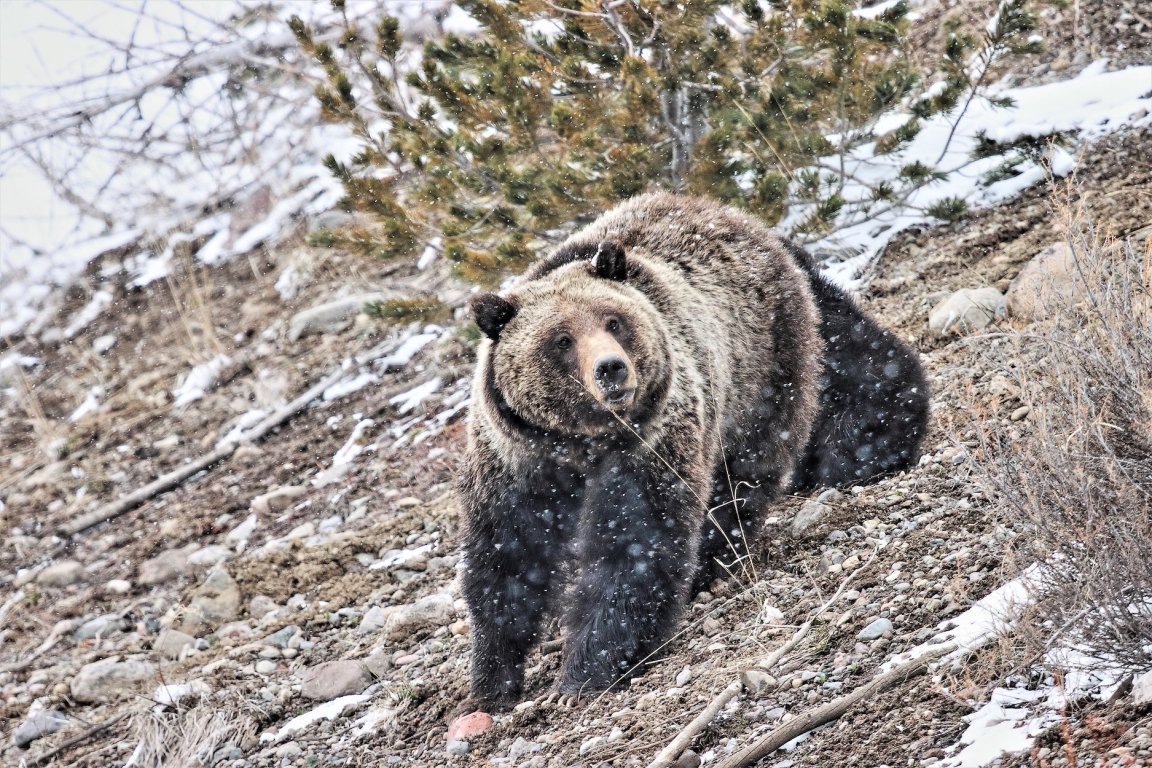 MFWP says the man was shed hunting on private land and walking along a snow-covered ridge with the wind at his back when he first saw grizzly bear tracks in the snow. He had two dogs with him. He continued walking and, a few minutes later, saw the bear standing roughly 20 yards away near the top of the ridge.