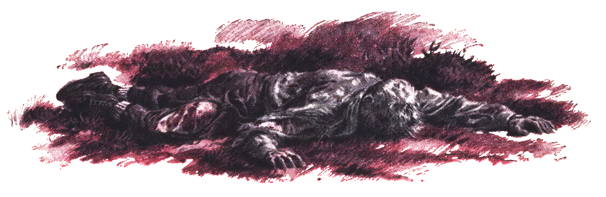 I don’t know whether I moved that time or whether he just wanted to make sure of finishing me. Anyway, he nailed me once more, this time by the back below my right shoulder. He bit through, ripped three ribs loose from the spine, and tore a hole all the way into my chest cavity. If he’d chomped a little lower, in the kidney area, that bite would have killed me.