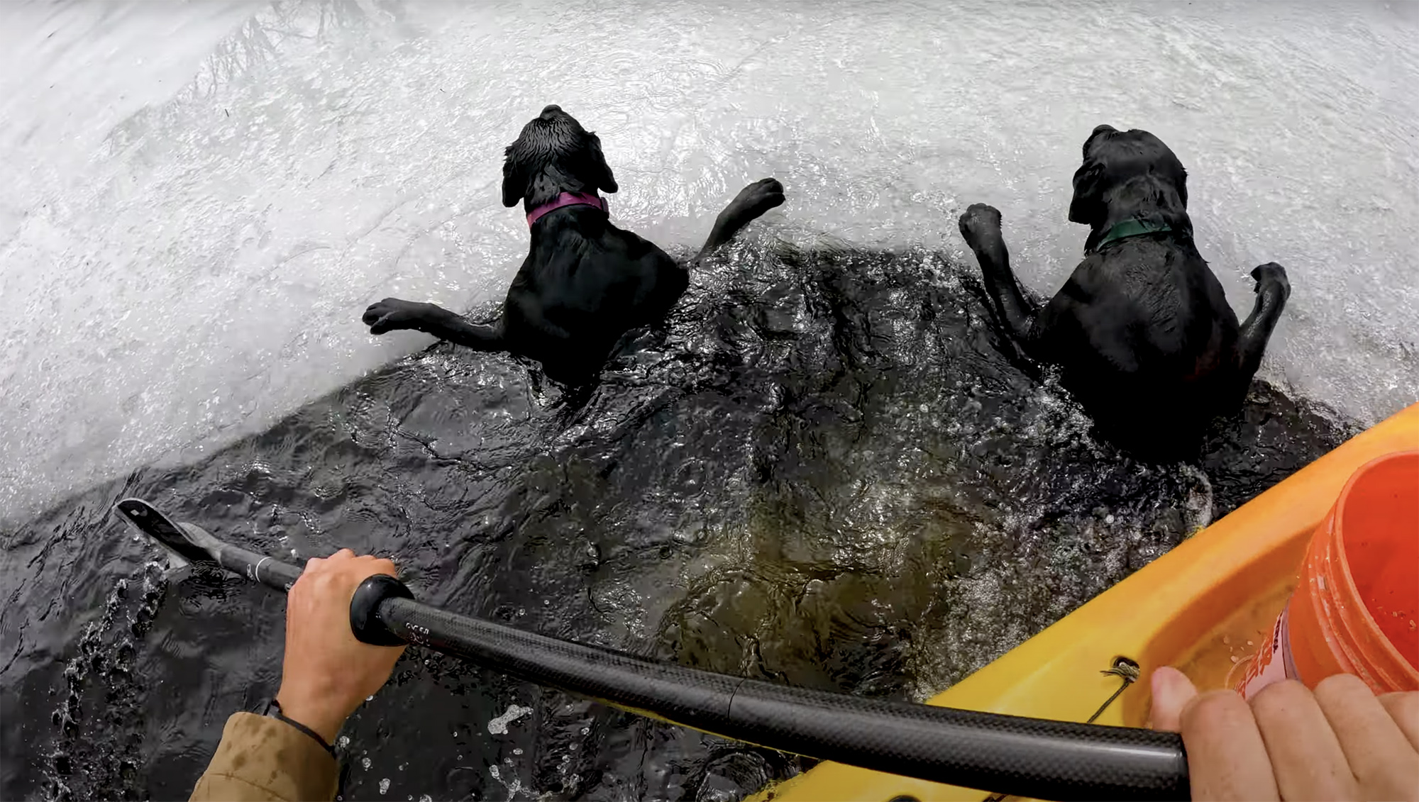 A recent college graduate and YouTuber who specializes in hunting and fishing content, Lalonde says he’d headed to the Sudbury River on March 6 to fish for carp. He was fishing from shore and using his pedal kayak to drop baits in the middle of the river, which was open in certain places but iced over in others. He hadn’t caught a thing when he saw two black Labs on the opposite bank run away from their owner and chase a pair of geese onto a sheet of ice. That’s when the dogs tumbled off the ice and into the half-frozen river.