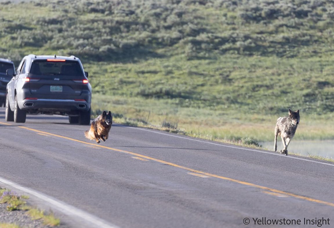 A group of tourists in Yellowstone National Park witnessed some canine-induced chaos Friday when a German shepherd jumped out of a moving car to chase down a gray wolf. The incident concluded as quickly as it began, with neither animal injured, according to local tour guide MacNeil Lyons, who captured the commotion in a brilliant series of photographs he shared to Facebook.