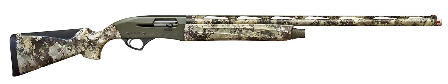 The receiver and magazine cap of Fabarm’s 3-inch 12-gauge XLR5 Waterfowler have a tough, olive drab Cerakote finish that resists corrosion. The synthetic stock and forearm are covered in True Timber Viper Western camo with a rubberized Soft Touch coating that provides a sure grip in wet conditions. The 28- or 30-inch Tribore HP barrel is covered in the same camo with a red fiber-optic front sight. Inside, the three-stage gradually tapering bore essentially acts as one long forcing cone to both reduce recoil and improve patterns. Three flush chokes (medium, long, extreme) and one extended choke with matching camo band are included. The soft-shooting, fast-cycling Pulse Piston gas system reliably handles a wide range of loads. The bolt handle, safety button, and trigger guard opening are all huge for easier use with gloves. Left-hand models also offered.