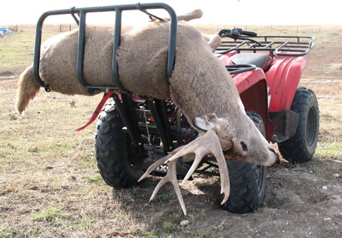 For more sophisticated deer removal, you can even get one of these racks. It allows you to transport your deer by ATV without having to hoist it up onto the quad. This is helpful for solo hunters who have shot big-bodied deer like this one.