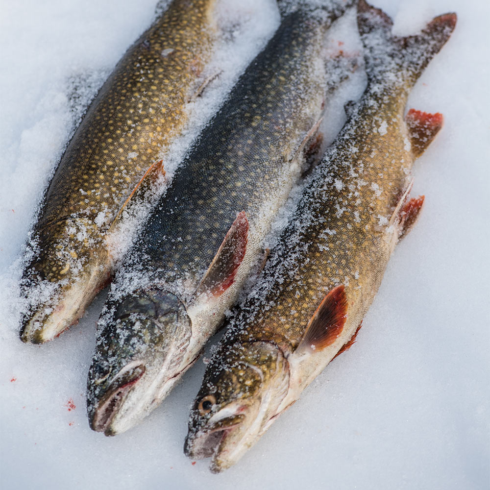 It only takes one laker to crack Leaf’s cool the next morning. The 18-inch trout is spotted bronze and gaping in the freezing air. Leaf is almost out of breath too, shaking as if he’d just shot a deer. The trout had inhaled the minnow, springing the tip-up and bringing Leaf sprinting. Minutes later, Shaver jigs another onto the ice with a gold spoon in its lip. By nightfall there’s a third pair of fillets, all of which Leaf fries for supper and we eat smothered in hot sauce.