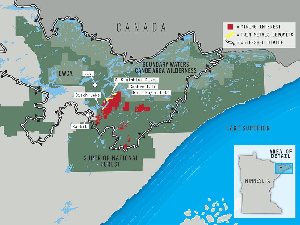 To be clear, mining isn’t allowed in the BWCA. Neither are activities like logging or motor vehicle use, all of which are commonly restricted in wildernesses. There’s also a mining buffer zone adjacent to some of the wilderness. Still, many deposits lie below the Superior National Forest, which allows mineral leasing. These leases have been the subject of a mind-numbing tug of war between mining and conservation groups spanning several administrations and courtrooms. The takeaway, however, is that these remarkable deposits occur not only in the same watershed as the BWCA, Quetico Provincial Park, and Voyageurs National Park, but also upstream from some of these parks’ major waterways and the BWCA’s tourist-attracting gateway: Ely.