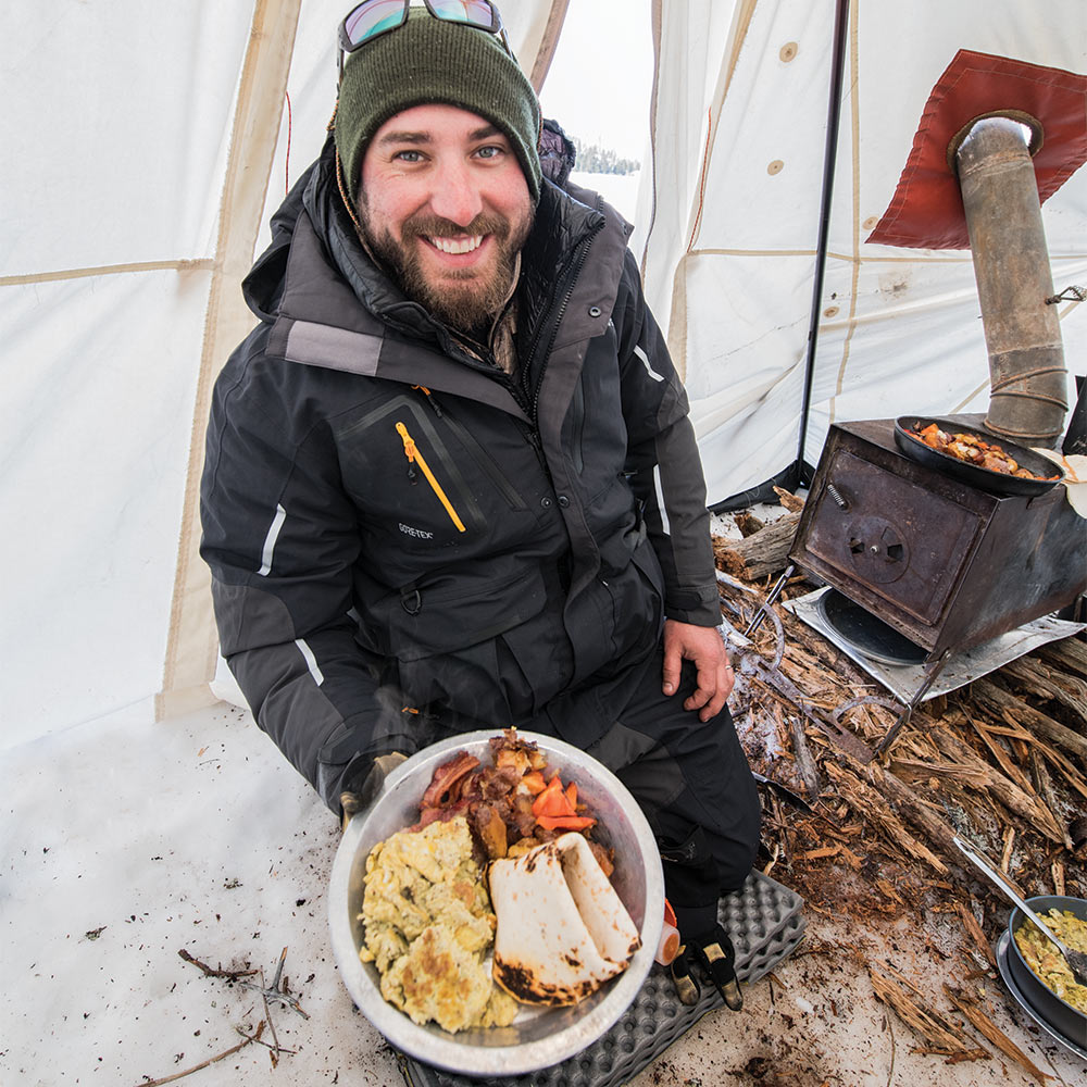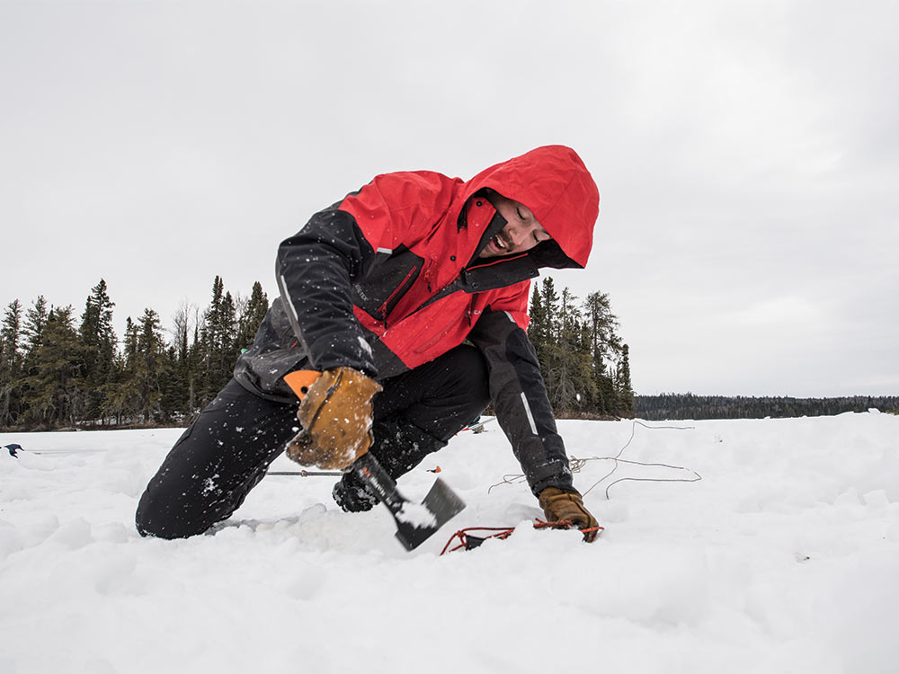 When my fingers numb to the point of clumsiness, I strap on snowshoes and a pulk, and waddle to a nearby island for firewood. I’m halfway there when I hear a shout and turn to see Shaver motionless, staring down one of the holes. It turns out he had hooked a big fish and patiently reeled until, at last, the scarred snout of a big pike broke the surface. The pike was 2 feet up when the line snapped and the fish splashed back, momentarily stunned. As Shaver reached to land it, it thrashed, then vanished.