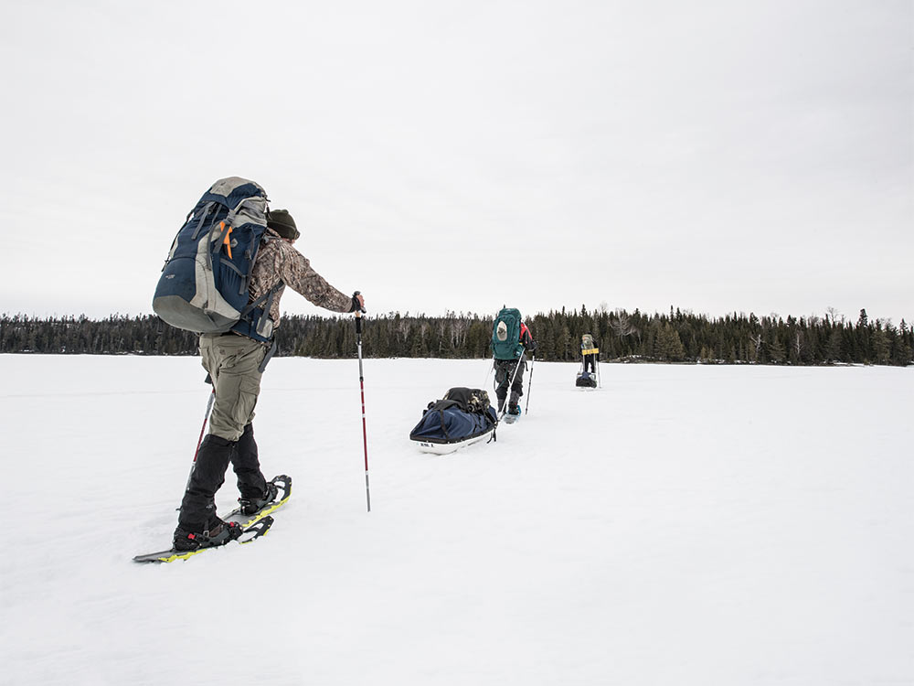 Our trail had begun at the edge of a frozen lake in Minnesota’s Superior National Forest and spit us out in the northern Boundary Waters Canoe Area Wilderness. To navigate canoe country in winter, we strapped on packs and, beneath those, chest harnesses attached to sleds, called pulks. At the trailhead, we crammed the pulks with everything from a wall tent and a wood stove to neon MSR snowshoes, two ice augers, and a bucket of live bait.
