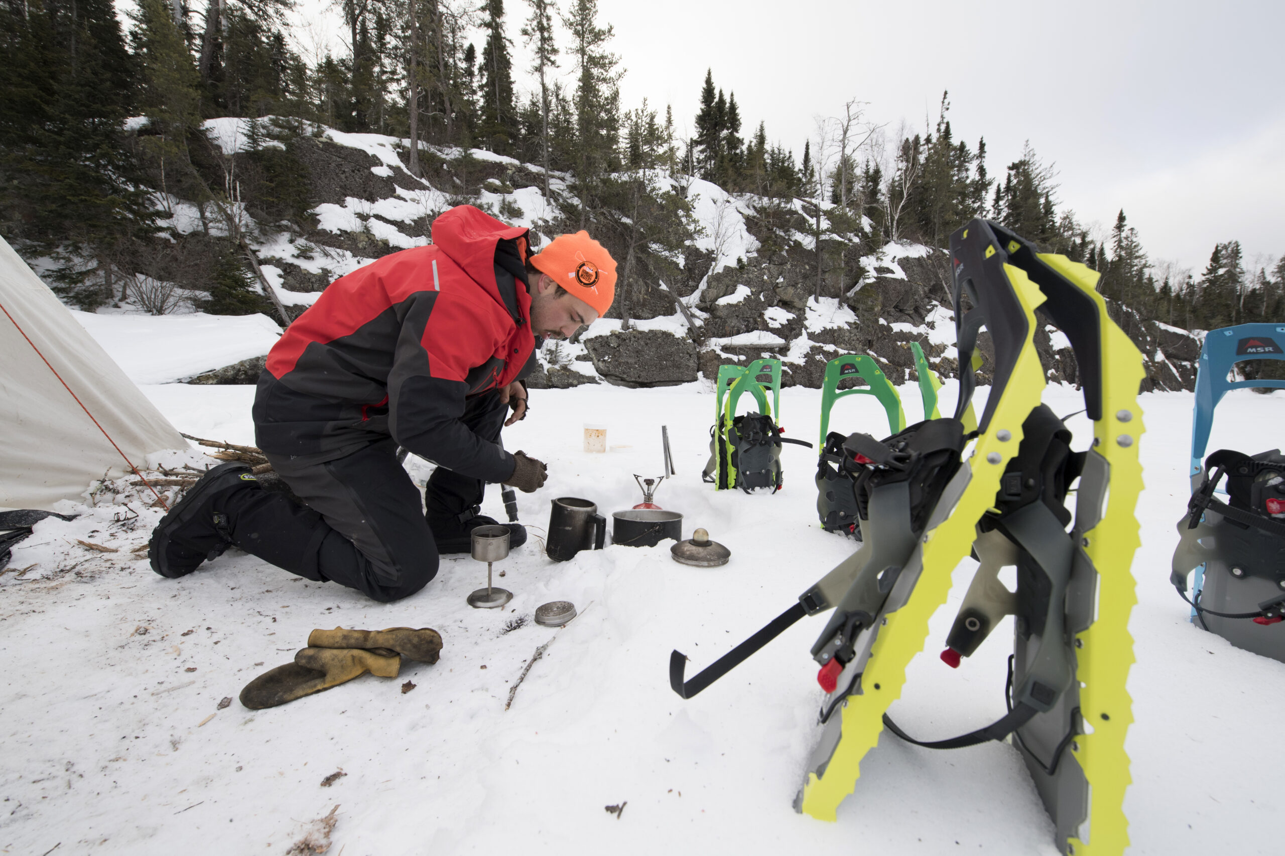 We make good time, reaching Tuscarora early in the afternoon. After strapping on snowshoes to break new trail for another mile, we find our chosen site on the ice, sheltered by a pine-crowded bluff. The outcropping is troctolite, a spotted rock geologists liken to a trout’s back. But the four of us are more interested in real trout, and we hurry to set up camp.